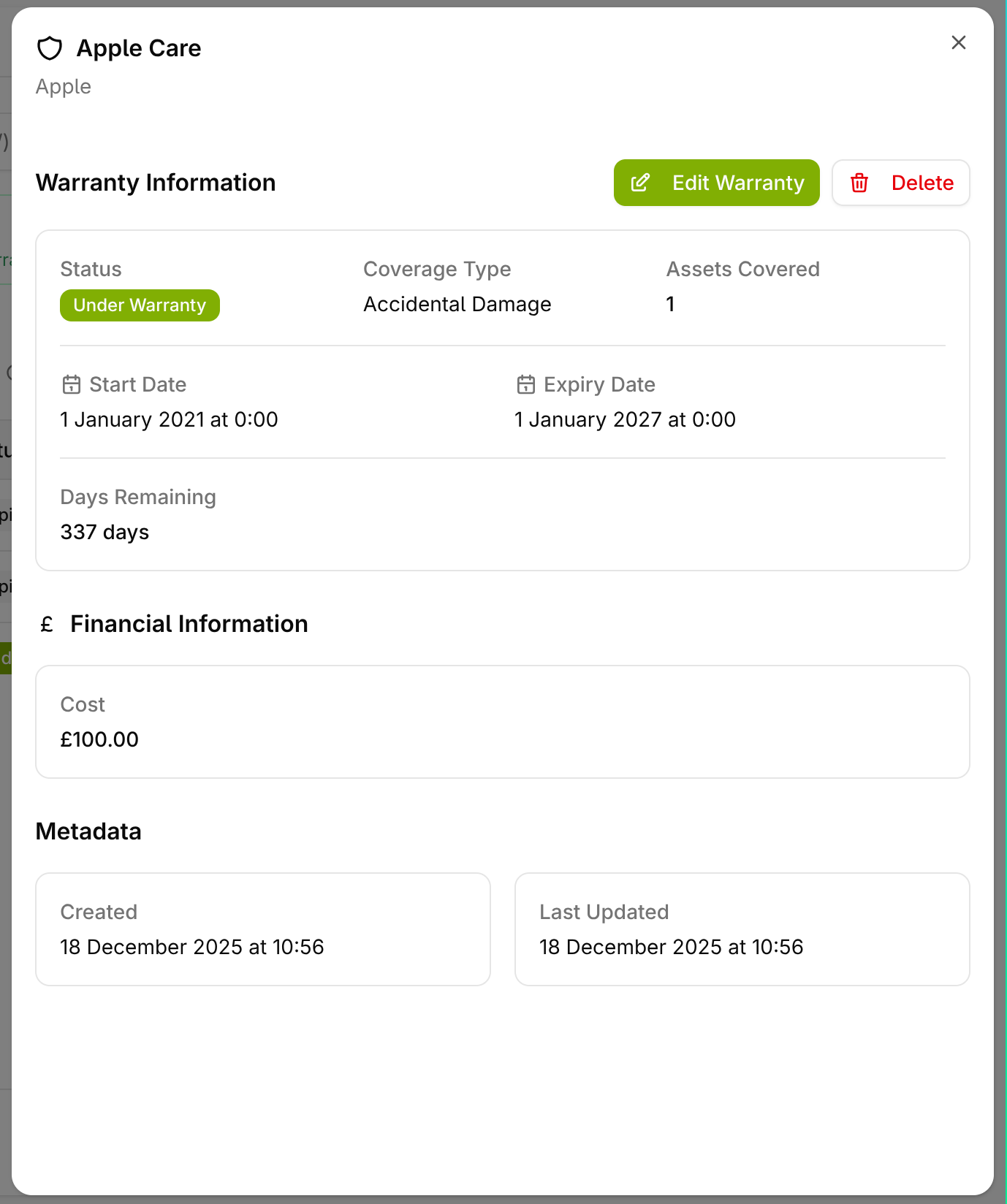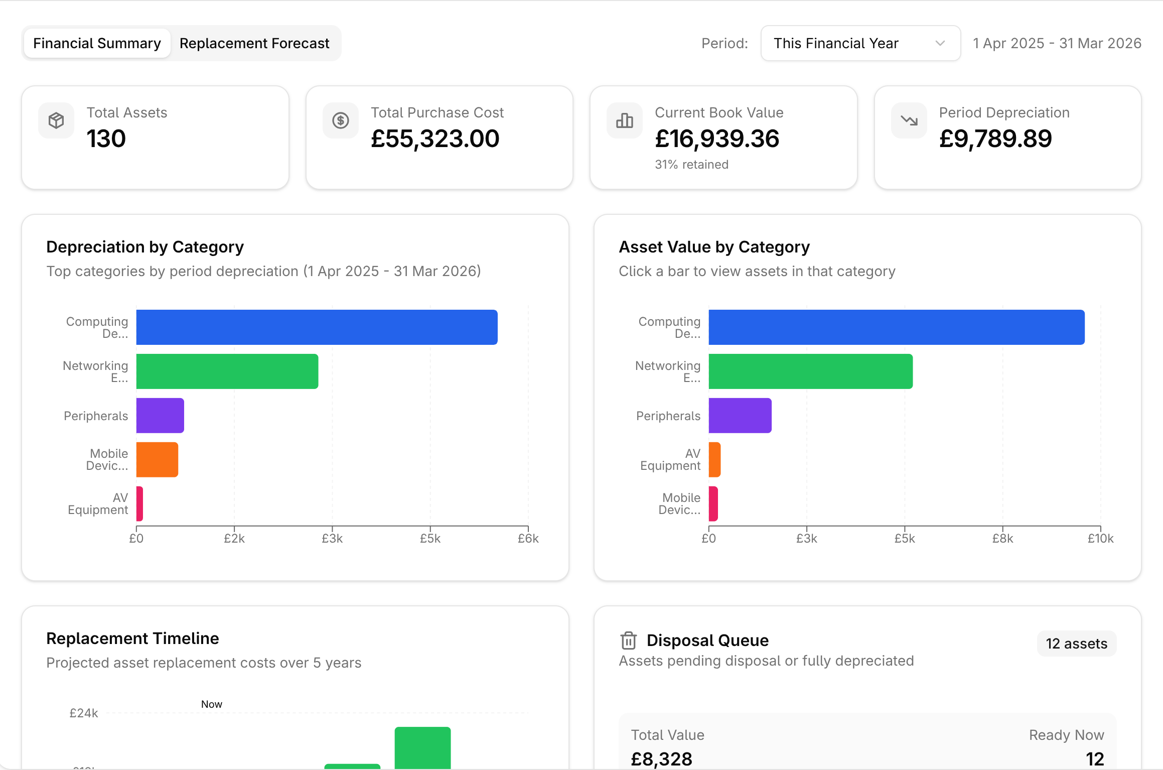 Track your assets. Know their value. Automate their exit. Disposal certificates attach automatically when it’s time to go.