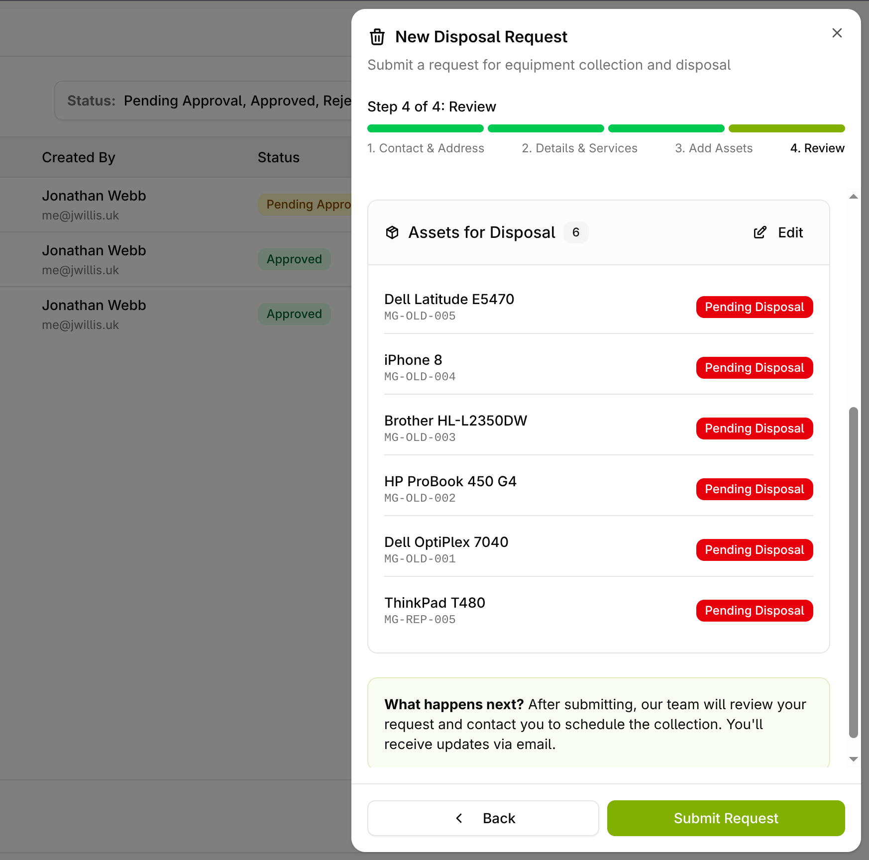 With Magic Disposal, the boundary between your software and our trucks disappears. Simply select your aging assets on the portal, trigger a Magic Disposal, and our team will handle the rest. No coordination emails, no manual data entry, and no paperwork.